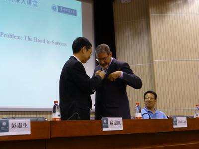 伴随着华师学子热情激动的掌声,Richard N. Zare教授佩戴着杨宗凯校长亲手赠予的华师徽章出场。