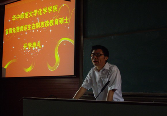 会上,杨军首先代表学院欢迎在座的2012级教育硕士研究生回母校继续深造。杨军肯定了首届免费师范生在过去一年里取得的喜人成绩,他指出,2007级144名免费师范生在全国29个省市自治区任教,其中有近40%的同学在担任化学学科教学任务之余,还担任了班主任工作,更有部分老师代表学校参加了省市比赛并取得骄人成绩。而本次共有113名免费师范生经过院系的筛选,获得了在职攻读教育硕士的机会。杨军在讲话最后还着重强调了在校期间的安全问题。