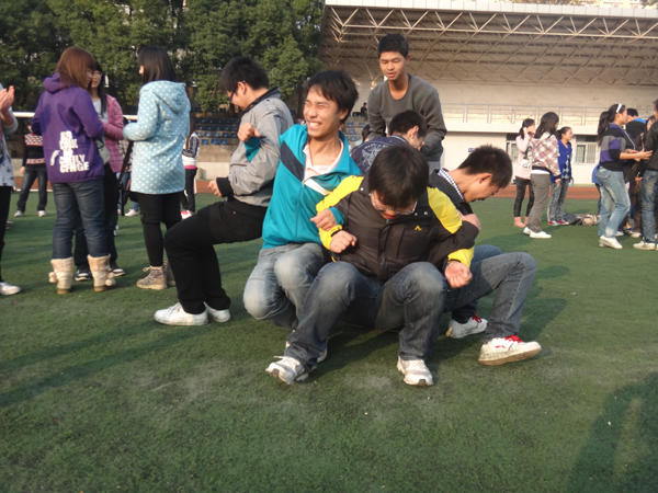 全体成员按照排列的8个小组的顺序依次站队,进入第一个游戏:解手链、背靠背。各位组员手拉手站好,“穿白色鞋子的女生到男生旁边”“有单恋对象的同学到圆圈中间”,在袁双双各种“莫名其妙”的指令下,将原有的顺序彻底打乱,再按刚才的顺序牵手,看哪个小组能够在最短时间内恢复原状。“背靠背”则是要求小组成员背靠背坐在一起,并依借背部的支撑站起来,由四个人慢慢累积,人数最多成功站立的获胜。“通过游戏,组员们相互加深了了解,培养了默契,为后面的比赛垫个基础。”七组的助理饶有趣味的看着成员们由开始时的稍显羞涩变得熟识,笑着说。