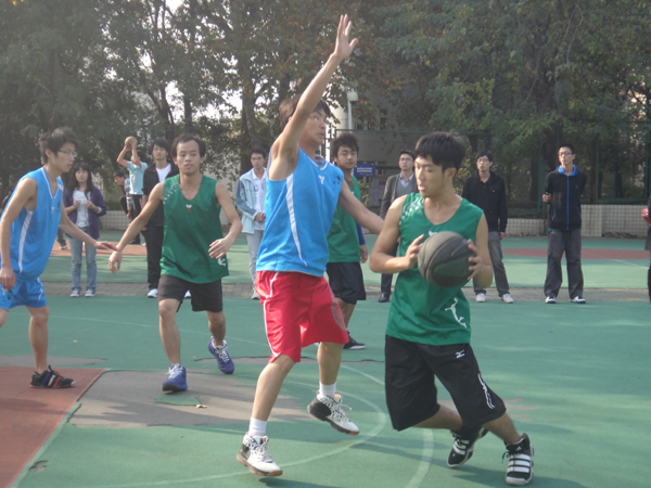 我院团委书记徐洪峰亲临比赛现场,为化院队员加油打气。随着裁判的一声哨响,我院与管理学院男篮比赛打响。第一个跳球开始,身着蓝色球衣的管院队员首先抢到球权,攻入本场比赛的首个进球。身着绿色球衣的化院男篮也不甘示弱,8号农炫翔很快突破至篮下,凭借灵活的脚步上篮拿下两分。此后,管院男篮频频出现失误,走步、打手,多次犯规。第一节结束,化院以13比7领先。