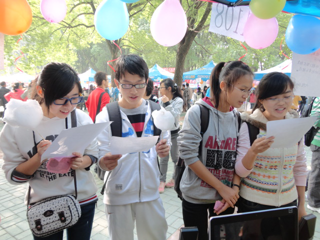 由于举办场地由原来的博雅广场转移到东区小树林,使得参与本次活动的人大大增加。活动开始没多久,小树林里就挤满了人。 这次活动的参与者并不仅仅局限于化院本院同学,还有很多来自各个院系的学生,甚至一些中老年人和小孩子。同学们玩得乐此不疲,在领奖处更是排起了长龙。在活动现场,一位文学学院的同学说自己来凑凑热闹,借此更加了解化学,并表示对本次活动很满意。
