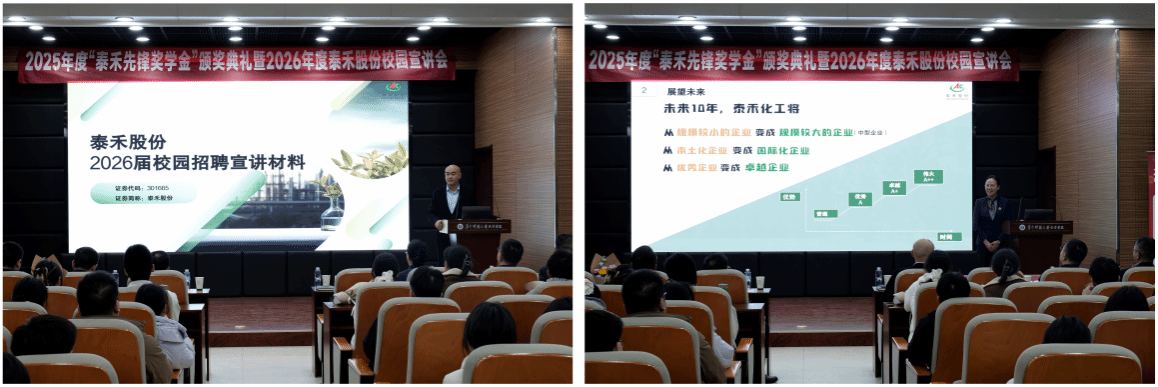 现场,泰禾股份开展2026年度校园宣讲会。段晓光系统介绍企业发展概况与核心业务板块,展现企业在绿色农药领域深耕多年的专业积累和创新实力。倪珏萍以《I-785的故事》为题,分享农药创制背后的科学逻辑与研发精神,让同学们近距离感受绿色农药创新的严谨与魅力。吕亮介绍泰禾股份的创制团队构成及岗位设置,为学生未来职业选择与发展提供明确参考。魏兆旺深入解读企业招聘体系、人才培养路径与员工发展规划,助力同学们全面理解企业人才机制。在场同学踊跃提问,积极互动。