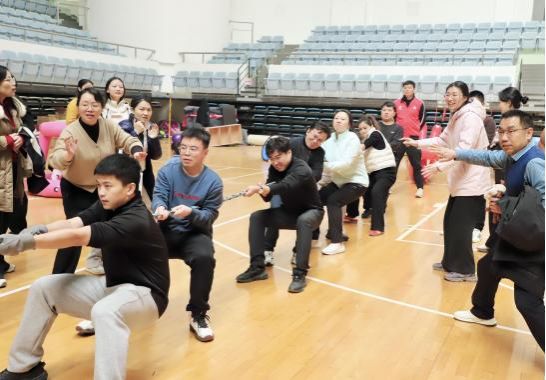 赛场上,各项目亮点纷呈。拔河比赛作为全场首个集体项目,瞬间点燃了现场氛围。各代表队队员们拼尽全力稳住阵脚,场边助威声此起彼伏,将团队协作的力量展现得淋漓尽致。“龙马精神”、“蜈蚣竞走”则考验着小组的同步性,大家喊着整齐的口号稳步前行。此外,“公鸡下蛋”的逗趣场面、“十拿九稳”的全力奔跑,也让现场充满欢声笑语,老师们纷纷卸下压力,享受运动带来快乐。