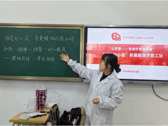 为夯实学院心理健康工作基础,丰富学生课余文化生活,着力打造具有学科特色的心理育人品牌活动,红石榴壹心灵驿站于4月15日在化学楼H505实验室成功举办了“心芳香——情绪疗愈实验室”系列首场活动——“相变与心流”香薰蜡烛制作体验。活动结合化学学科特色,以蜡材“固-液-固”的相变过程隐喻情绪的流动与转化。在工作人员指导下,同学们精准控温、调香配色,在严谨的实验操作中体验专注的“心流”状态。随后的感悟书写环节,引导大家在文字中梳理情绪变化、正视自我。