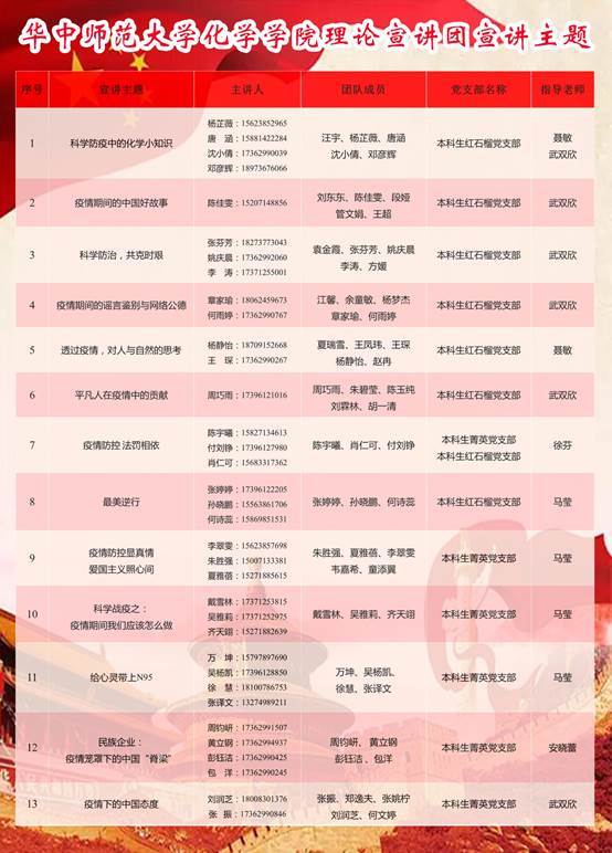 为深入学习贯彻习近平总书记关于疫情防控工作的重要指示精神,充分发挥党支部战斗堡垒作用和学生党员先锋模范作用,在化学学院党委的全面领导下,本科生党支部成立化学学院理论宣讲团,选拔、培养了一批学生党员宣传骨干,深入各党支部、团支部等学生组织开展理论宣讲,促进党建带团建,引领广大青年不断坚定“四个自信”,增强打赢疫情防控人民战争、总体战、阻击战的决心和信心。