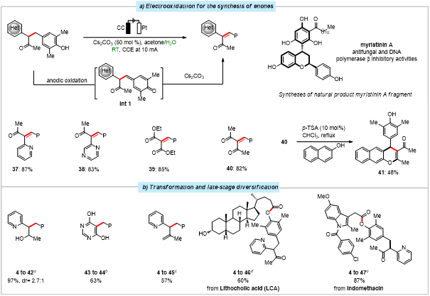 通过提高反应电流可进一步实现单取代产物的电氧化脱氢反应,高效、高选择性构建E式烯酮类化合物。同时利用该方法,能够合成苯并吡喃等天然产物的核心结构单元(图3)。