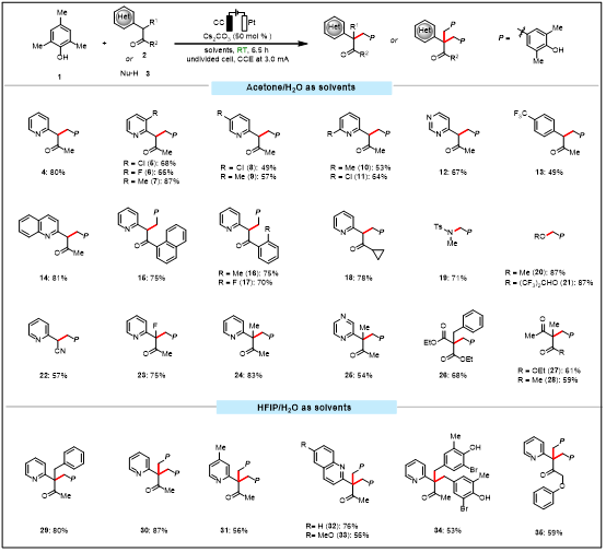 近日,华中师范大学徐浩教授课题组使用两种溶剂体系成功地实现了对甲基酚的单/双烷基化反应的选择性调控,该策略有以下特点:1) 改变溶剂体系实现反应化学选择性调控;2) 底物适用范围广,能够实现C-C, C-O, C-N氧化偶联;3) 能够实现全碳季碳中心的构建;4) 反应无需电解质和催化剂。