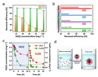 该工作通过简单的磷酸化方法制备了径向裂纹纳米零价铁,用于高效处理重金属废水。以Ni(II)去除为例,径向纳米裂纹作为界面电子/离子传输通道,有利于Ni(II)快速向内扩散,电子与铁离子向外转移,实现表面(Ni(II)/e-)与界面(Ni(II)/Fe0)的电子置换。同时,CnZVI可增加表面Ni(II)的浓度梯度,有利于Ni(II)向内扩散,并降低O2在表面竞争电子的影响。与nZVI主要将Ni(II)吸附于表面不同,CnZVI能够迅速还原并将Ni成功固定于氧化层中,去除容量高达(258 mg Ni/g Fe)。这种新型纳米零价铁对Cu(II)、Cr(VI)、Hg(II)等其他几种典型重金属离子也有很高的去除效率。在实际电镀废水处理中,CnZVI可实现Ni(II)与Cu(II)的同时去除,并达标排放。除了重金属去除,这种新型零价铁也极有可能具有放射性废物的富集与贵金属回收的前景。