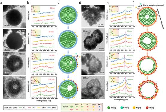 为了可视化重金属去除过程中的界面传质与电子置换作用,论文通过透射电镜监测单个铁纳米颗粒结构随时间变化过程。反应60 min,nZVI铁核内出现一个偏离中心的小空穴,随时间延长,空穴逐渐长大。反应240 min后,观察到一个中空环形结构,由未反应的Fe0和氧化层组成,剩余Fe0约占原始nZVI的50%。而CnZVI的空洞在反应30 min时就已出现,反应120 min可观察到完全空心化的CnZVI,并且有微小的Ni0纳米颗粒(7-8 nm)固定于CnZVI的氧化层中。