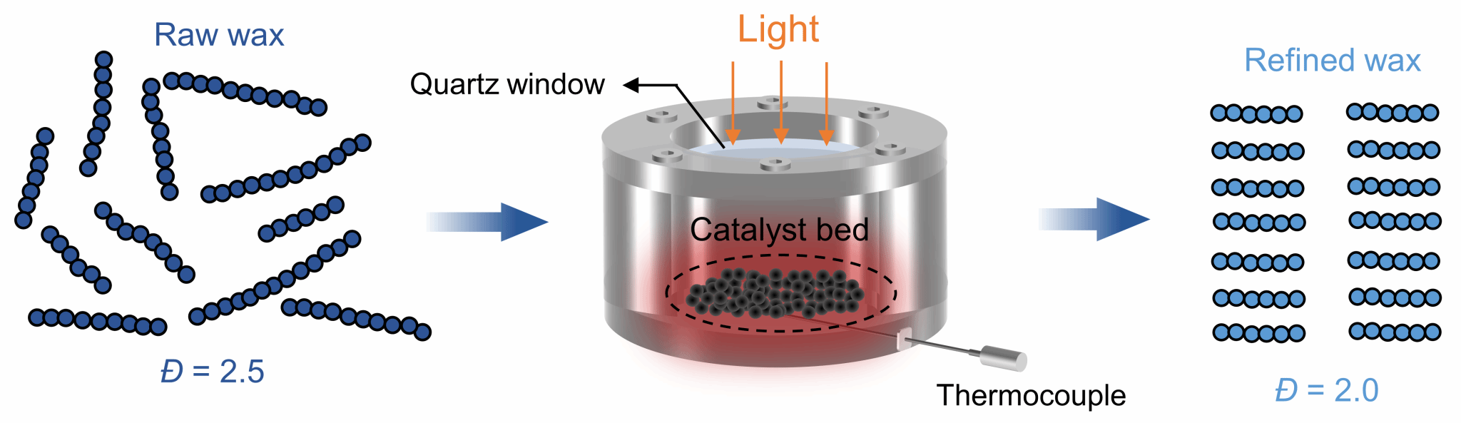 蜡作为石油提炼和塑料生产的副产品,通常具有碳链分布广泛、品质较低、产能过剩的特点。蜡精炼通过提高分子碳链长度的均一性并去除杂质,将粗蜡转化为高品质蜡产品。然而,传统热化学方法由于对原料蜡中C-C键的非选择性断裂,难以有效降低碳链分散度,需要进行复杂的后续处理,包括能源密集型的分馏和提纯工艺。本团队创新性地利用光激发产生表面局域热效应,以清洁太阳光为唯一能量来源,纳米零价铁为催化剂,将碳链分散度高的粗蜡转化为分散度低的精炼蜡,无需额外复杂的提取和分离过程。在铁氧化物-石蜡界面处,光子活化C-H键以提供氢原子,同时局部热点通过氢原子转移引发的加氢裂化以及伴随的碎片石蜡产物的蒸发分离介导C-C键的选择性断裂,从而实现对碳链分布的精准调控,其选择性超过80%。这项工作展示了精确且高效的太阳能精炼技术的潜力。