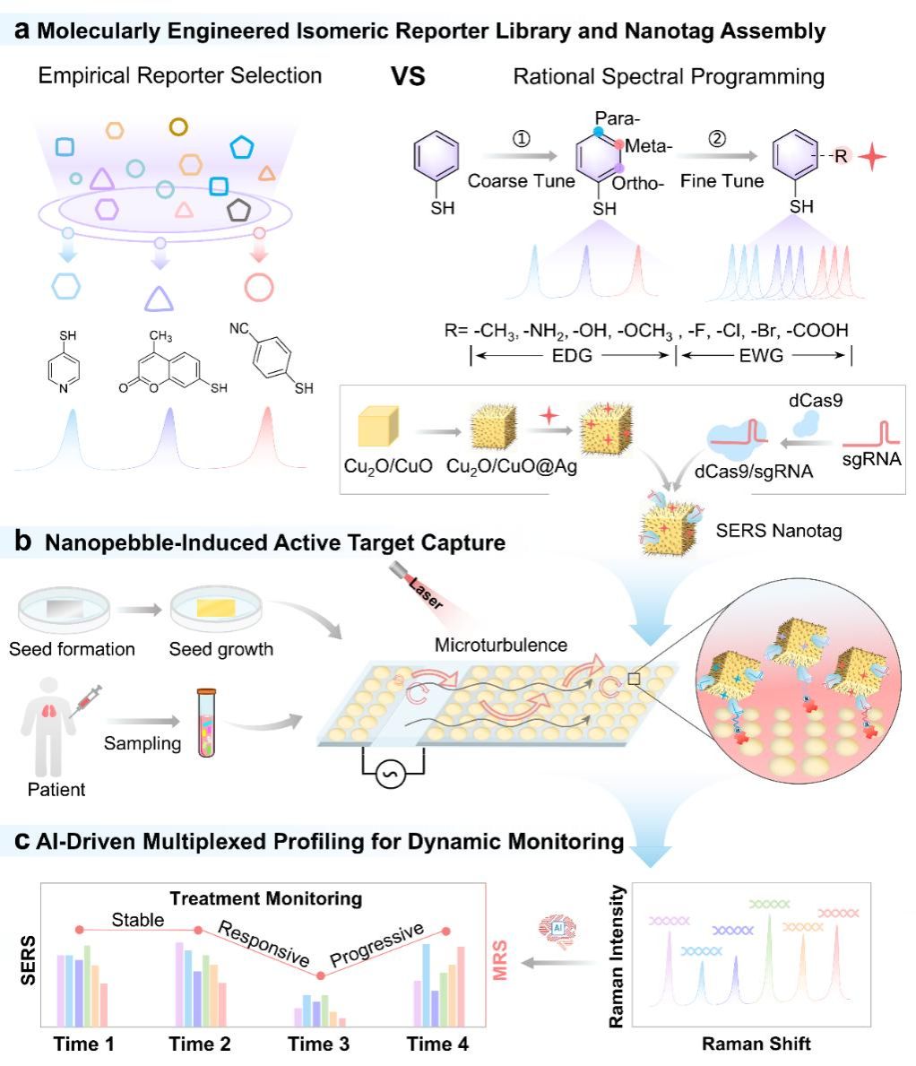 图1. 使用mt-EHD进行肺癌ctDNA多重分析的分子工程化SERS平台示意图。