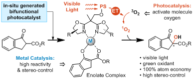 In this study, Xiao and co-workers have successfully developed a novel family of visible-light-responsive chiral ligands by grafting a triplet state photosensitizer to chiral bisoxazoline ligands. Complexation of this ligand with Ni(acac)2 results in a powerful catalyst for the asymmetric oxidation reaction of β-ketoesters, which uses oxygen or air as the green oxidant and visible light or sunlight as the ideal driving force. Using this protocol, products containing the α-hydroxy-β-dicarbonyl motif are produced in high yields and with excellent enantiopurities.